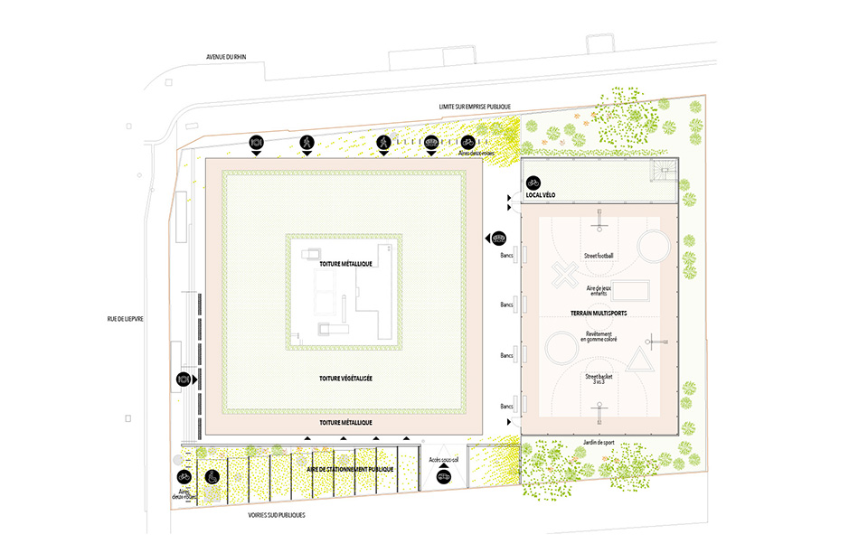 Au pied de l’immeuble, un terrain multisports familial, en libre accès, agrémenté d’espaces verts, vient améliorer la vie des occupants et des habitants du quartier.