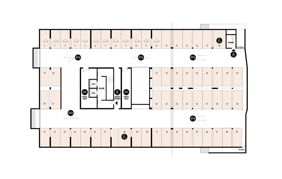 Au sous-sol, 59 places de parking et un local deux-roues sécurisé sont intégrés au projet ainsi que 10 places de parking publiques et deux aires vélos en extérieur.