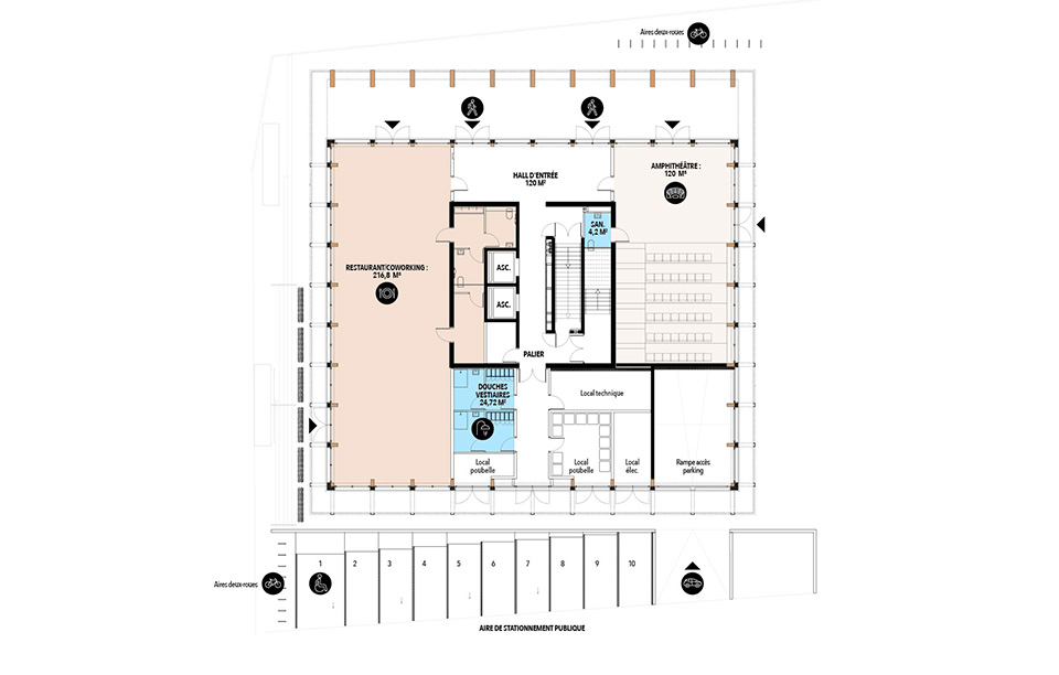 À rez-de-chaussée, accessible depuis le carrefour et l’avenue du Rhin, un plateau ouvert à tous, « la grande galerie », rassemble le lobby des bureaux, un pôle restauration dans un espace de coworking connecté et un amphithéâtre à usage partagé.