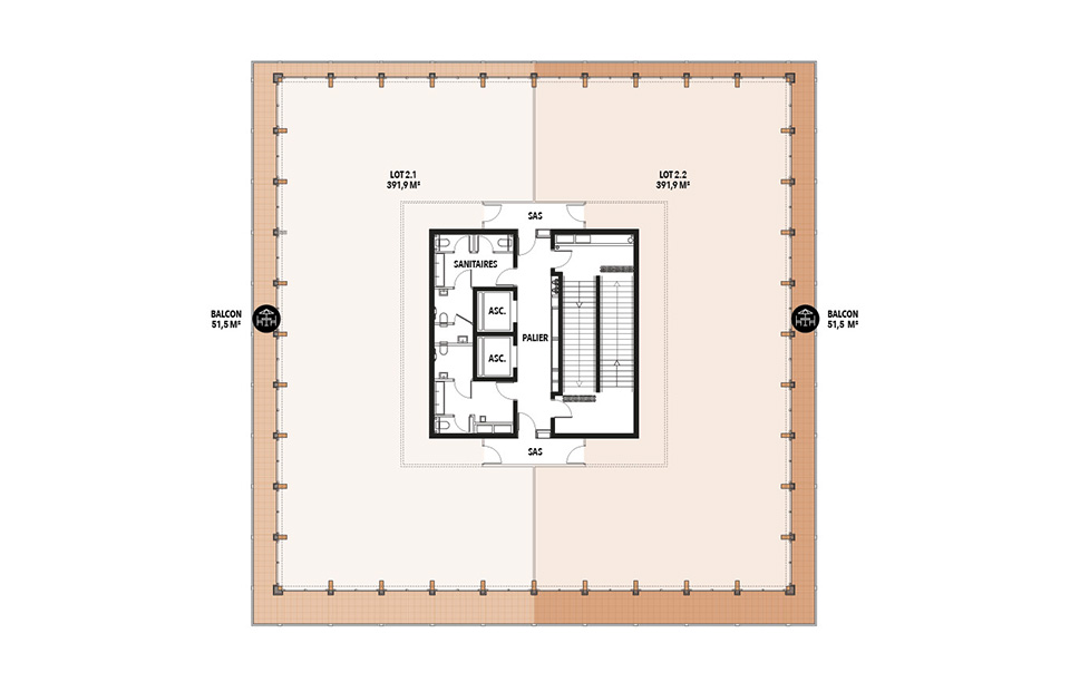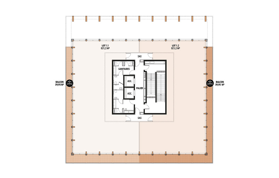 L’immeuble est doté de plus de 754 m² de balcons et coursives répartis sur tous les niveaux offrant à l’utilisateur la possibilité de disposer d’un espace extérieur pour chaque bureau ainsi qu’un espace logistique permettant la maintenance et le nettoyage des façades.